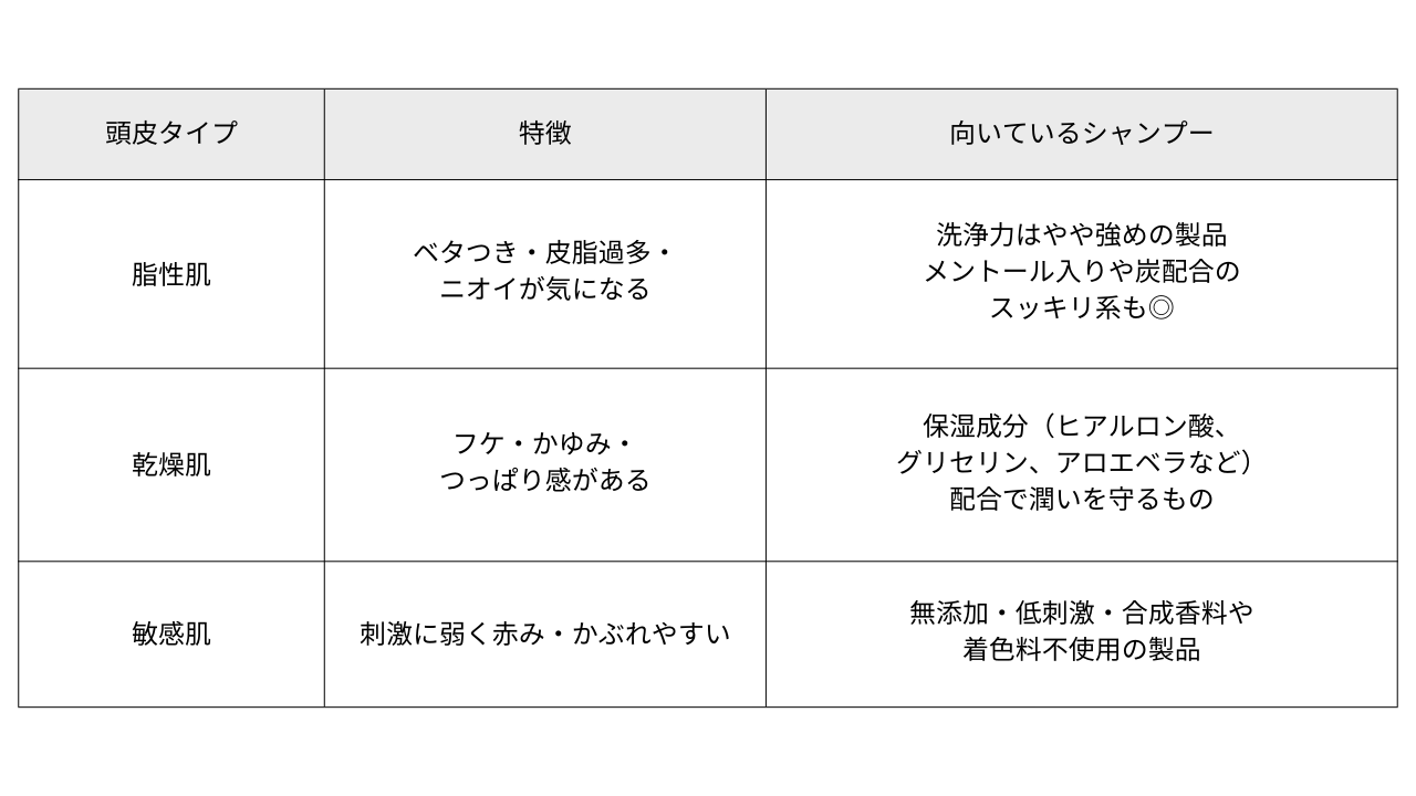 頭皮の状態には個人差があり、自分の頭皮タイプに合ったシャンプーを選ばないと、逆効果になってしまうこともあります。ぜひ下記の表を参考に、シャンプーを選んでみてください。
